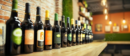 A row of wine bottles on a rustic wooden bar counter against a stylish backdrop.