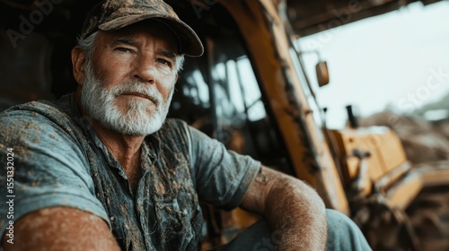A rugged and weathered farmer with a beard sits thoughtfully beside his machinery, reflecting a hardworking spirit in a rural landscape, conveying a sense of dedication and strength.