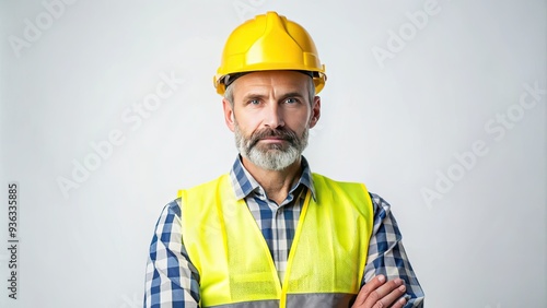 A rugged construction worker in a yellow hard hat and reflective vest stands proudly against a clean white background, exuding confidence and professionalism.