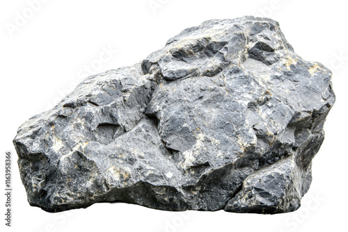 A rugged, dark rock with a textured surface, showcasing natural features and mineral variations.