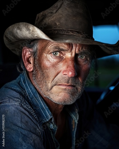 A rugged farmer in a cowboy hat, sitting on a tractor with a determined expression, their face weathered from years of fieldwork