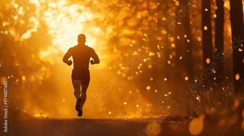 A runner jogs through a sunlit forest, surrounded by golden leaves, embodying energy and tranquility in nature.