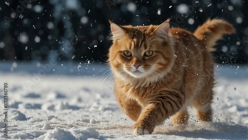A running cat surrounded by snowflakes.