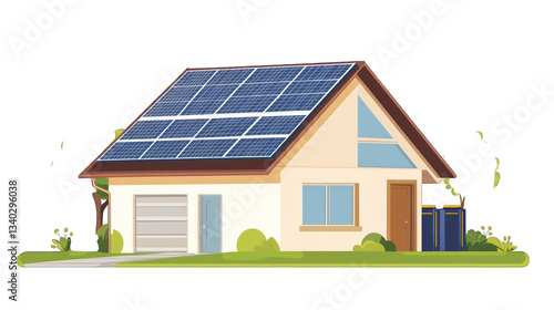 A rural house with off-grid solar panel installation and battery storage on a transparent background