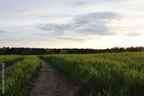 A rural landscape, namely a dirt rural road laid through a green field in the sunset. You can use it on a postcard, banner or screen saver on your desktop.