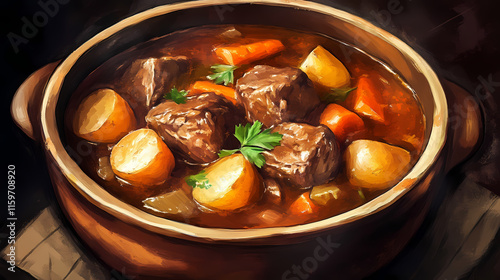 A rustic bowl filled with a hearty beef stew, featuring tender chunks of meat, golden potatoes, and vibrant carrots, all simmered in a rich and flavorful broth. Gossamered. Illustration