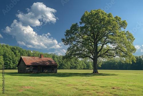 A Rustic Cabin Nestled Under a Majestic Tree in a Green Meadow