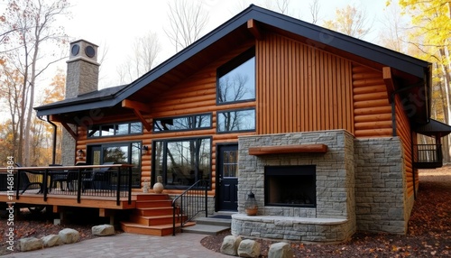 A rustic cabin with wood accents, large windows, and a porch