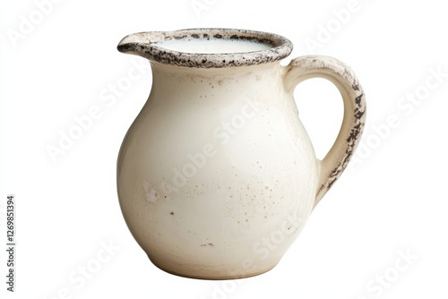 A rustic ceramic jug filled with fresh cream resting on a wooden table in soft natural light isolated on transparent background