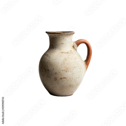 A rustic ceramic jug with a rounded body and a curved handle, featuring a speckled surface and a distinct orange-hued rim.