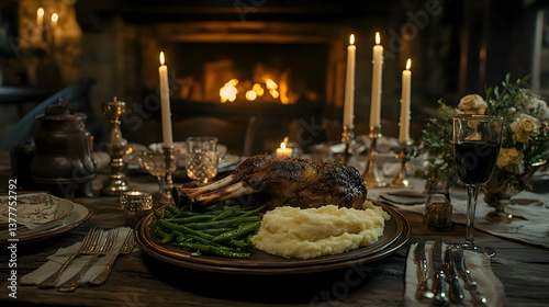 A rustic dinner table featuring herb-roasted lamb shanks, mashed potatoes, and sauted green beans, styled with candlelight and a warm atmosphere