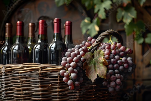 A Rustic Display of Wine Bottles and Fresh Grapes in a Basket