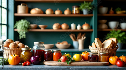 A rustic kitchen scene with homemade jams, breads, and pumpkins. Autumn vibes!