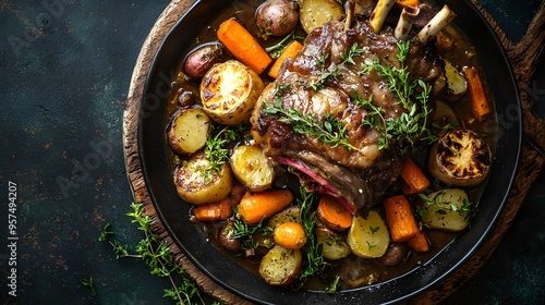 A rustic overhead view of tender braised lamb shanks served with a medley of root vegetables, garnished with fresh herbs.