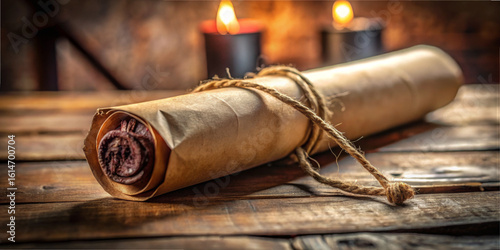 A rustic scroll tied with twine rests on a wooden table, illuminated by the warm glow of candles nearby, creating an inviting and historical atmosphere