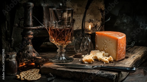 A rustic setting featuring cheese, a glass of whiskey, and a knife on a wooden board.