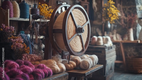 A rustic spinning wheel setup with wool roving and skeins of yarn