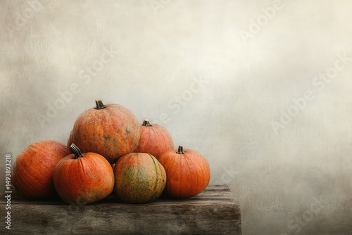 A rustic still life featuring a pile of small, orange pumpkins on a weathered wooden surface against a neutral background.