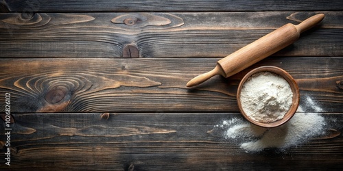 A Rustic Wooden Background Featuring a Bowl of Flour and a Rolling Pin, Ideal for Baking and Culinary Themes