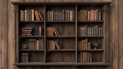 A rustic wooden bookshelf filled with a variety of vintage books and decorative items in a cozy study setting.