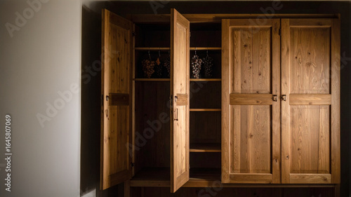 A rustic wooden cabinet with open doors reveals shelves holding two bunches of fresh grapes, creating a natural and cozy atmosphere in a dimly lit setting.