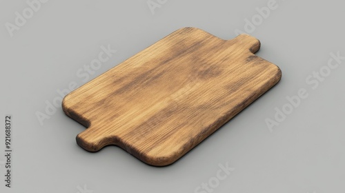 A rustic wooden cutting board with a natural brown finish, with a curved handle, lies on a gray surface.