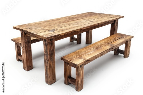 A rustic wooden dining table and benches set sits elegantly in a furniture studio