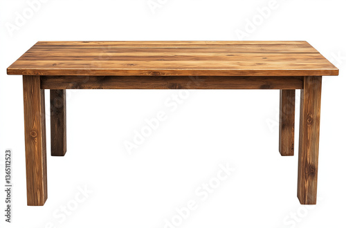 A rustic wooden dining table isolated on a white background continues to echo authentic craftsmanship and warm character.