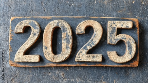 A rustic wooden sign with the year 2025 in large, distressed numbers painted in aged white on a dark blue background, evoking a vintage and classic feel