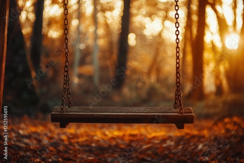 A rustic wooden swing hangs in a sun-drenched autumnal forest, peaceful and serene.
