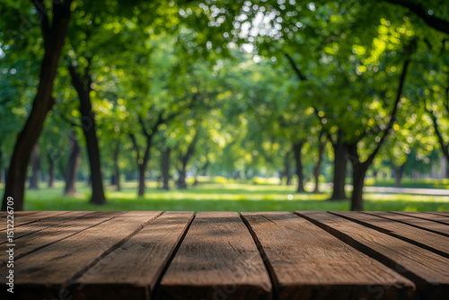 A rustic wooden table in focus with a blurred background of a serene park filled with vibrant green trees and sunlight filtering through.