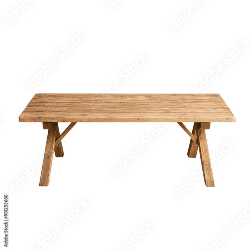 A rustic wooden table with a simple design, featuring a natural finish and sturdy legs, set against a black background.