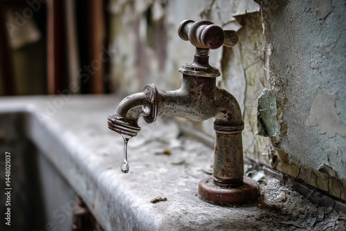 A rusty faucet slowly drips water in a neglected room with peeling walls and debris scattered around, showcasing years of abandonment Generative AI