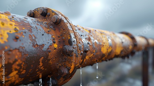 A rusty metal pipe with bolts covered in water droplets, highlighting corrosion and weather exposure. The wet surface adds depth, emphasizing the industrial scene. AI generated.