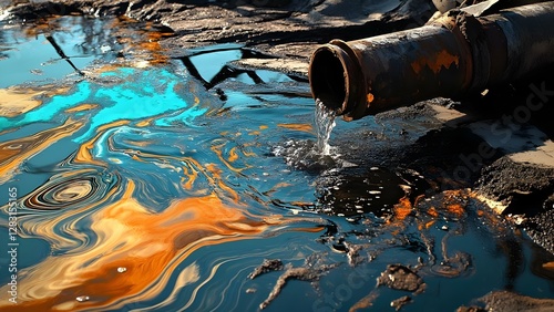 A rusty pipe discharges water into a pool of colorful, swirling liquid, likely indicating pollution or industrial runoff. Concept Pollution Impact, Industrial Runoff, Water Contamination
