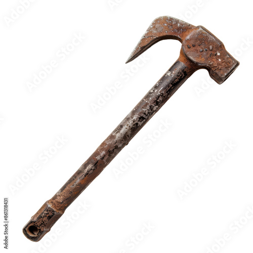 A rusty, weathered claw hammer isolate on white background. The tool shows signs of wear and tear, with a chipped head and a rough handle.