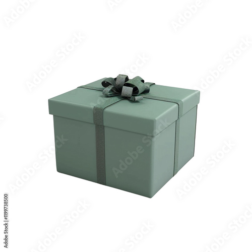 A sage green gift box with a matching ribbon bow sits on a transparent background perfect for design projects or holiday celebrations