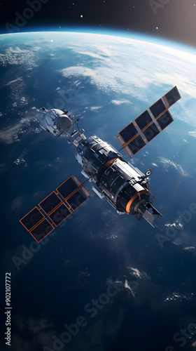 A satellite orbits Earth, showcasing its solar panels and a glimpse of the planet's blue surface and white clouds.