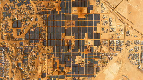 A satellite view of a solar park where solar panels are neatly arranged to form parallel rows, capturing solar energy effectively.