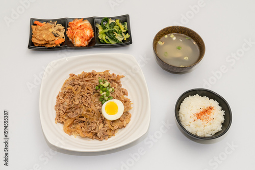 A savory beef rice bowl served as a set meal, featuring tender slices of beef simmered in soy-based sauce atop steamed white rice. The dish is accompanied by a variety of side vegetables and a light
