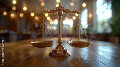A scale of justice placed on a wooden table in a courtroom, with a blurred background