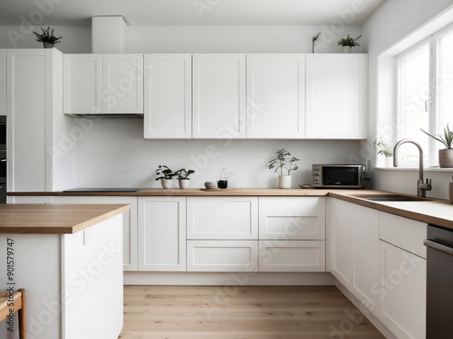A Scandinavian kitchen featuring white cabinets, light wood countertops, and simple, modern appliances.