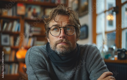 A Scandinavian person thoughtfully designs digital art in a warm and inviting studio filled with books and natural light