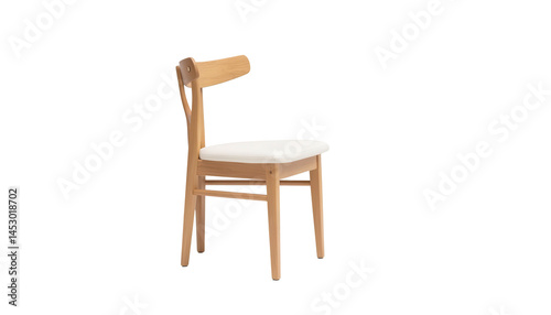 a scandinavian style dining chair with light oak frame and white cushioned seat, placed on a white surface