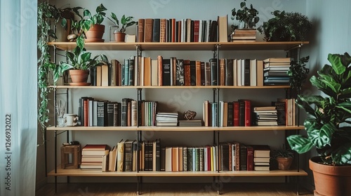 A Scandinavian-style shelving unit with decor items and books neatly arranged. digital