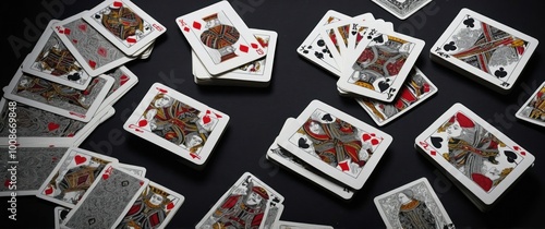 A scattered arrangement of playing cards on a black background, evoking a sense of strategy and excitement in card games.