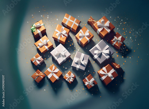 A scattering of elegantly wrapped gifts in copper and white, adorned with delicate bows, rests on a teal surface, sprinkled with shimmering confetti. The scene is lit with a soft, focused light.