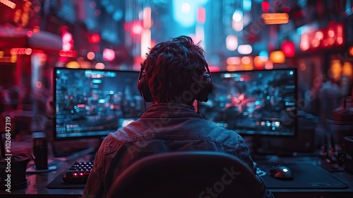 A scene of a gamer playing video games and streaming online, representing the immersive experience of modern digital entertainment.