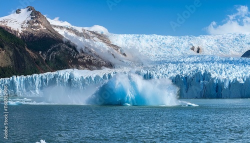 A scene where a glacier collapses due to global warming, causing huge ice blocks to fall