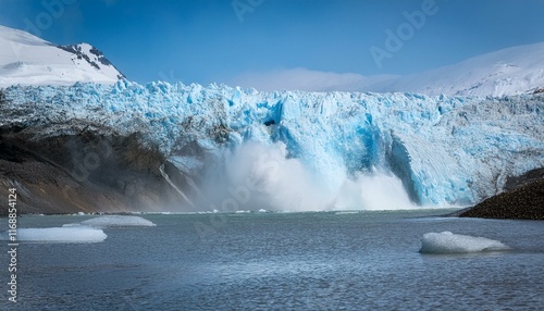 A scene where a glacier collapses due to global warming, causing huge ice blocks to fall